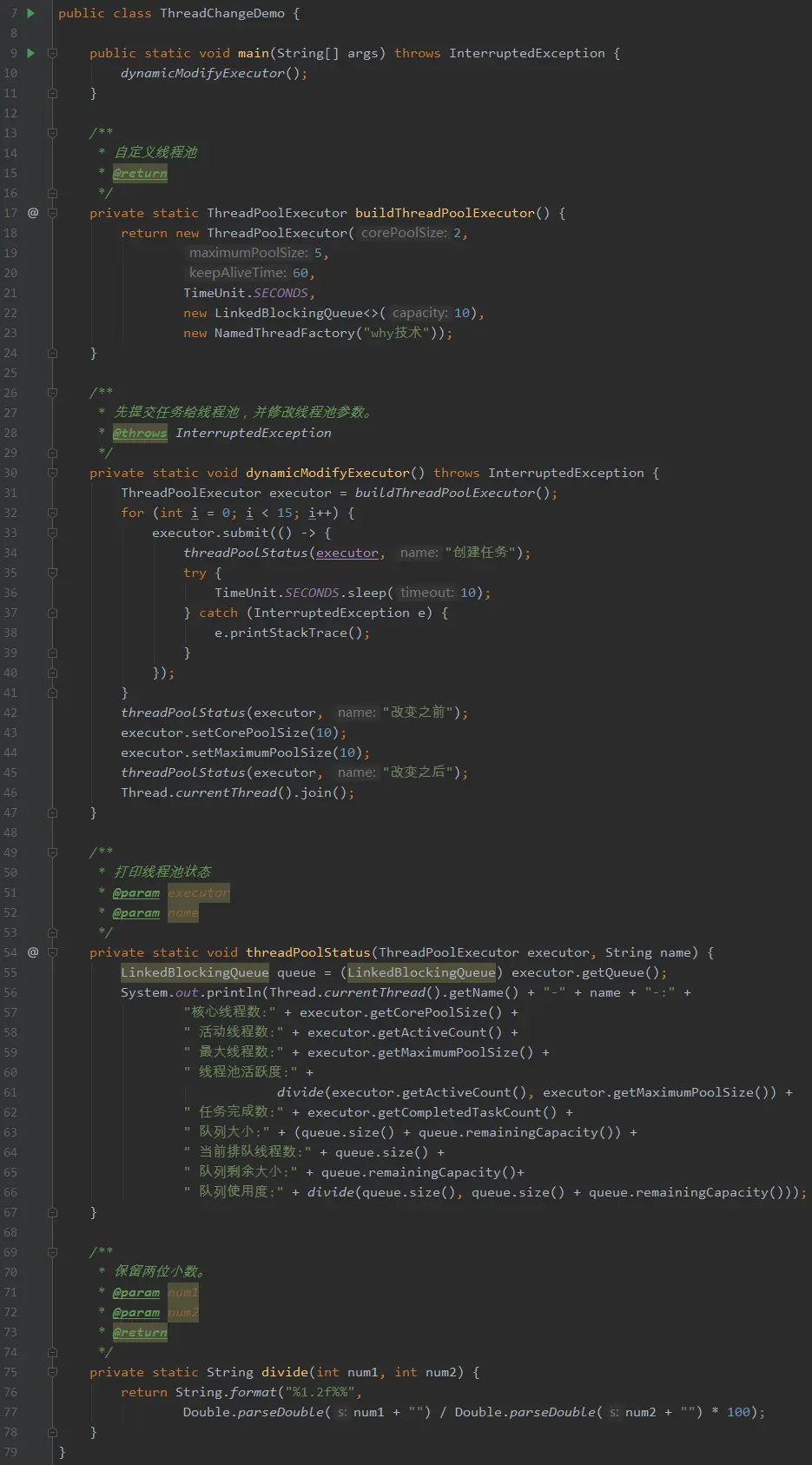 经过前面两个方法的分析,我们知道了最大线程数和核心线程数可以动态调整。