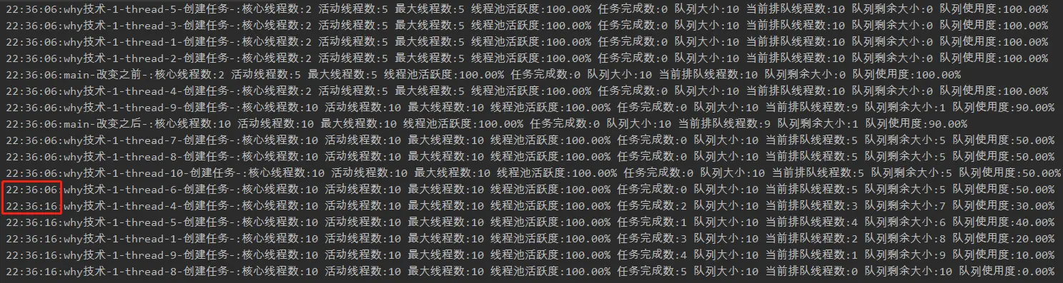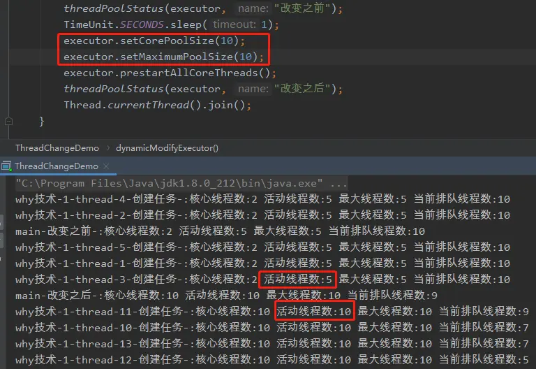 但是从日志还是可以看出,修改之后核心线程数确实变成了 10,但活跃线程数还是为 5。