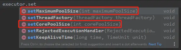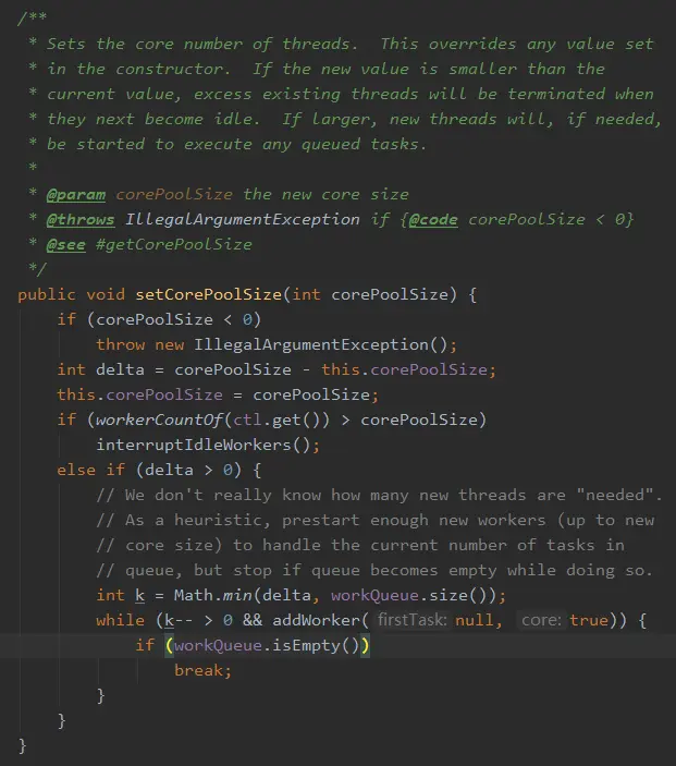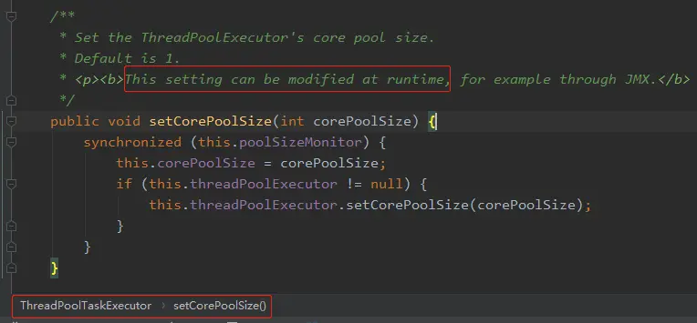 看了美团的那篇文章后,我又去看了 Spring 的 ThreadPoolTaskExecutor类 (就是对JDK ThreadPoolExecutor 的一层包装,可以理解为装饰者模式)的 setCorePoolSize 方法: 注释上写的清清楚楚,可以在线程池运行时修改该参数。