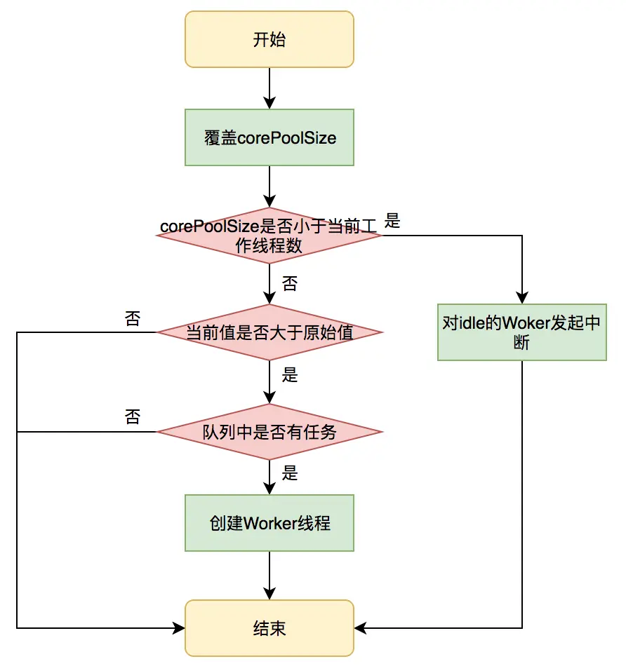 对于当前值大于原始值且当前队列中有待执行任务,则线程池会创建新的worker线程来执行队列任务,setCorePoolSize具体流程如下: