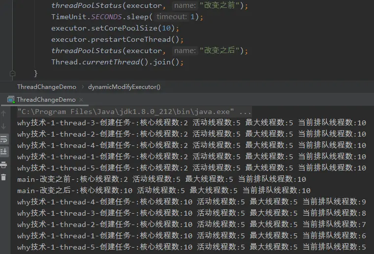 改变之前的核心线程数是 2,最大线程数为 5,我们动态修改核心线程数为 10。