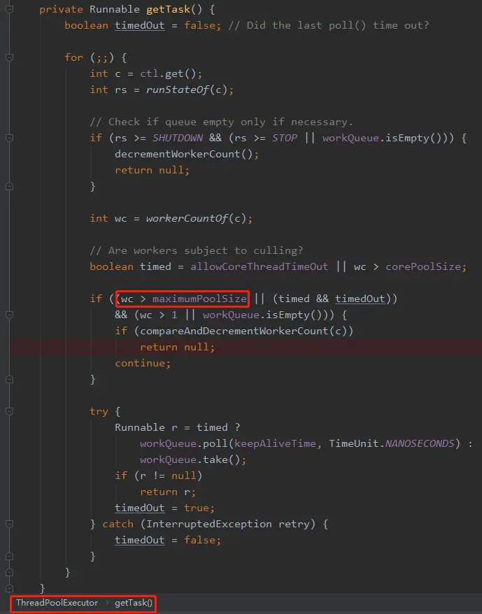 在这个方法中我们可以看到,如果工作线程数大于最大线程数,则对工作线程数量进行减一操作,然后返回 null。