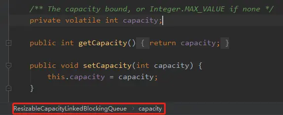 操作起来也非常方便,把 LinkedBlockingQueue 粘贴一份出来,修改个名字,然后把 Capacity 参数的 final 修饰符去掉,并提供其对应的 get/set 方法。