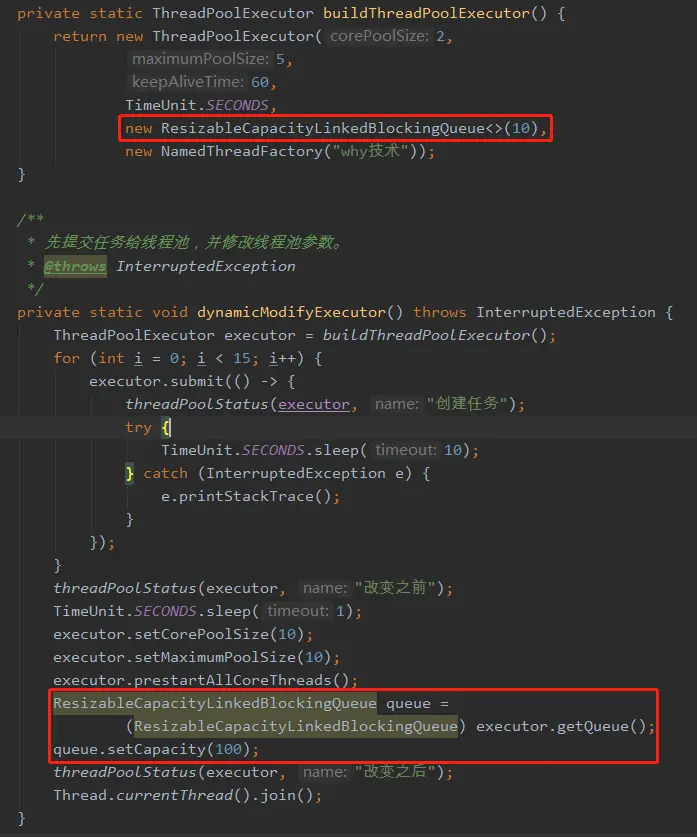 前面介绍了最大线程数和核心线程数的动态设置,但是你发现了吗,并没有设置队列长度的 set 方法啊?