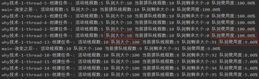 可以看到,队列大小确实从 10 变成了 100,队列使用度从 100% 降到了 9%。