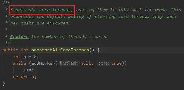 线程池被创建后如果没有任务过来,里面是不会有线程的。如果需要预热的话可以调用下面的两个方法: