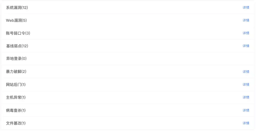 - 安全配置基线检测:包括各种不安全或者错误的配置信息;
