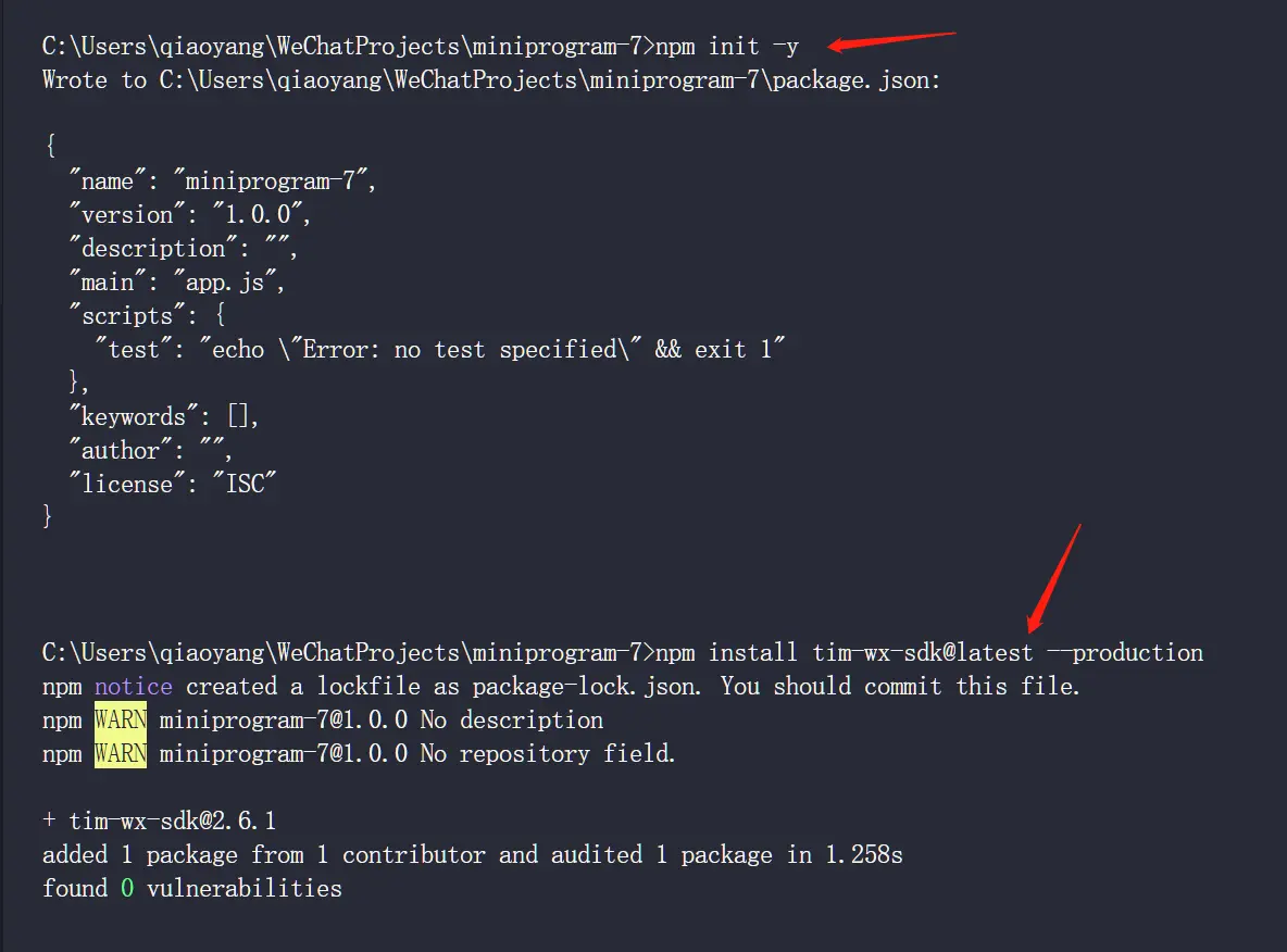 3、下载腾讯云即时通信 IMSDK:npm install tim-wx-sdk@latest --production