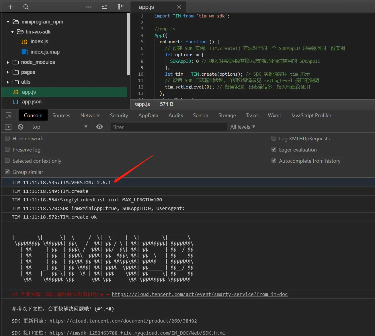 控制台如果能看到 TIM.VERSION: 2.6.1 的日志,表示接入成功。