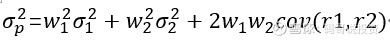 其中,w1是r1的所占比例,σ1是r1的收益率方差,w2是r2的所占比例,σ2是r2的收益率方差,cov(r1,r2)是r1和r2的协方差,也可以简写成σ12。具体的数学推导今天先不展开了.