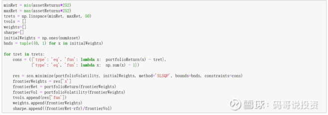 利用scipy.optimize,我们可以算出不同的组合期望收益率对应的组合波动率、每个资产的比例和夏普比率。我这里设定了一个限制:所有资产比例总和加起来要等于1,也就是说要求电脑算法100%利用所有的股票。