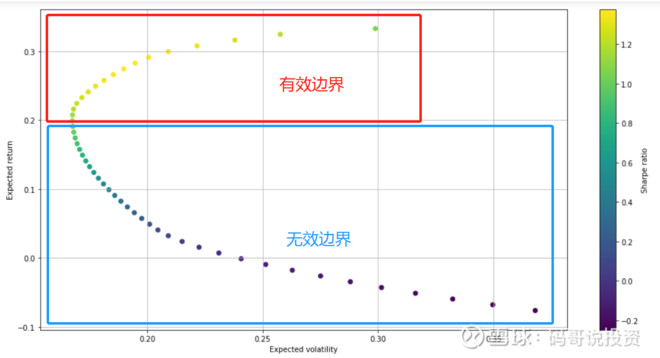 无效边界之所以是无效的,是因为在同等或者相似的风险下(波动率),可以找到更好的投资组合比例,使得组合收益率更高。你可以尝试垂直x轴画一条线,这条垂线会和整条边界线有两个交点,一个在上面的有效边界上,一个在下面的无效边界上。有效边界上的交点代表的投资组合有更高的收益率,而且它的风险和无效边界上的组合是差不多的。所以,对于理性的投资者,有效边界上的组合才是值得投资的。