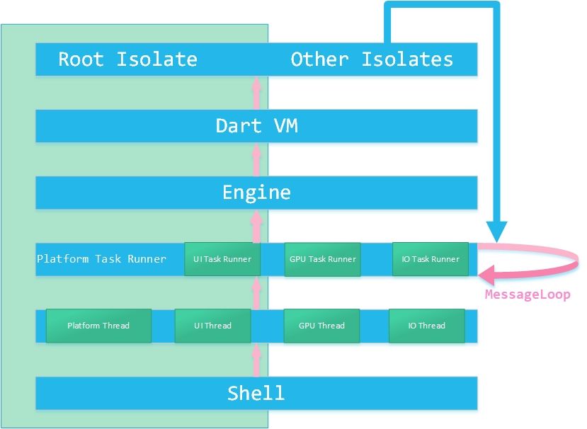 上述这些操作都是通过DartVM调度Isolate去实现的,目前Google在Android平台上TaskRunner的策略是,一个Engine实例创建一个UI TaskRunner,一个IO TaskRunner,一个GPU TaskRunner,所有的Engine实例共享一个Platform TaskRunner和他的Thread。