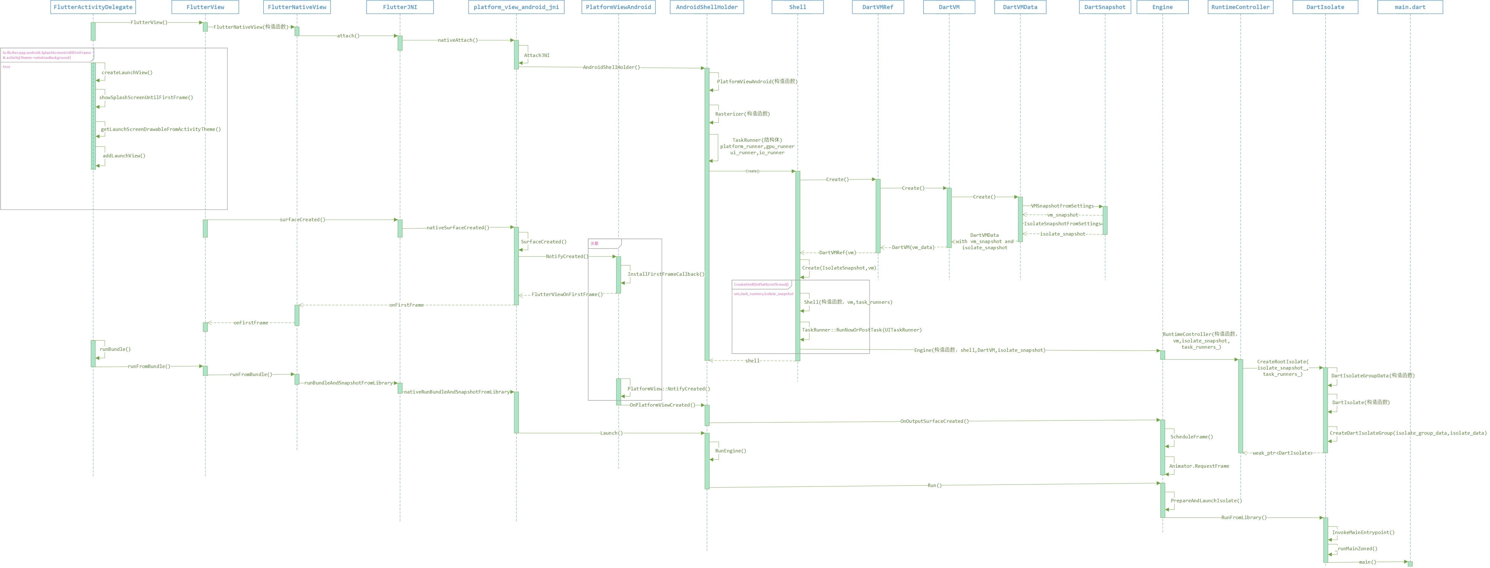 - FlutterActivityDelegate,代理。创建了FlutterView和FlutterNativeView,然后将Activity的生命周期和各种回调给到FlutterView处理