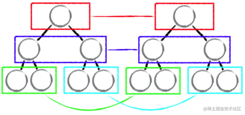 diff 算法只会比较相同颜色框中的节点,这种分层比较策略会让 diff 广度遍历一次 Virtual DOM Tree 后就完成整棵树的比较。
