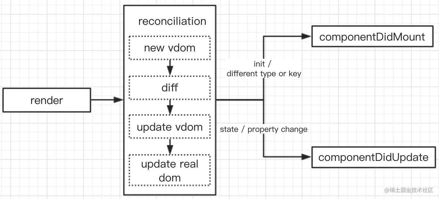 通过 diff 算法,React 可以找出新老 Virtual DOM Tree 的最小差异集,下一步就是要把这些变化通过最少步骤更新到真是DOM节点上,React 把构造新Virtual DOM -> 执行diff算法 -> 更新老Virtual DOM -> 更新真实DOM 这一系列称为 reconciliation 流程。
