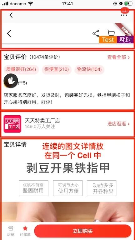 经过优化后,图文详情部分仍然是一个大 Cell,里面罗列了一系列高度自适应的商品图片。我们的方案避免了 Cell 首次出现时,所有图片一次性全部加载,导致内存突然飙高造成 OOM。同时在列表滚动过程,同一个 Cell 中的图片可以按需回收,使内存水位保持在合理水平。总结