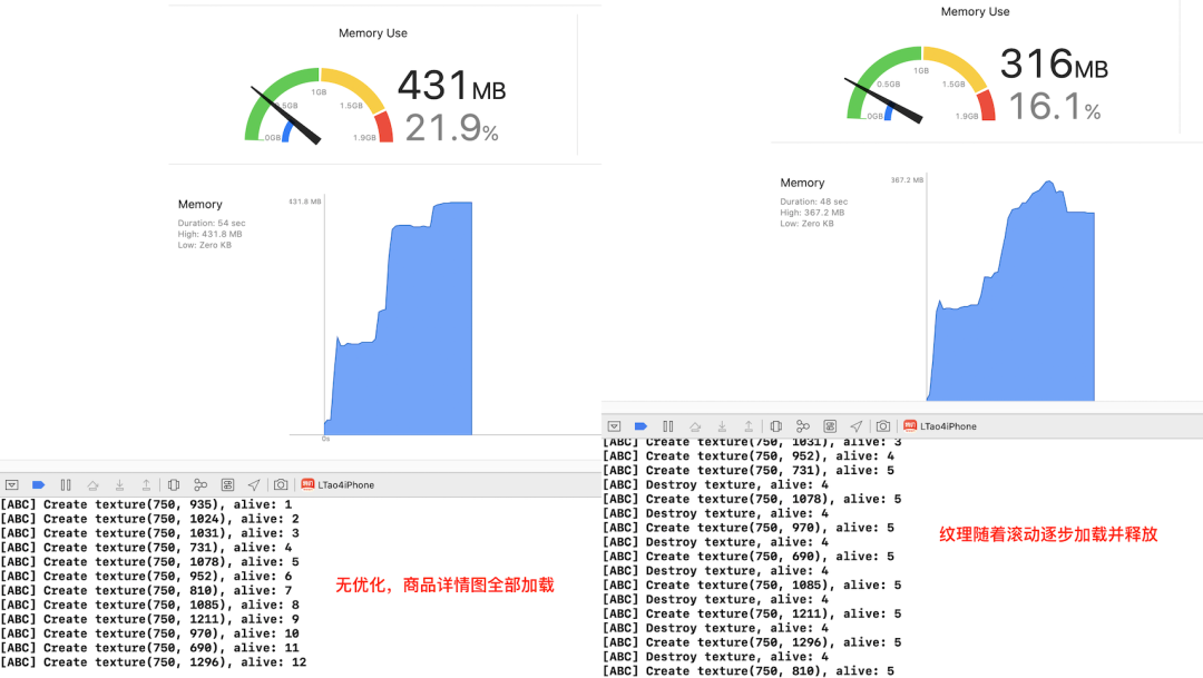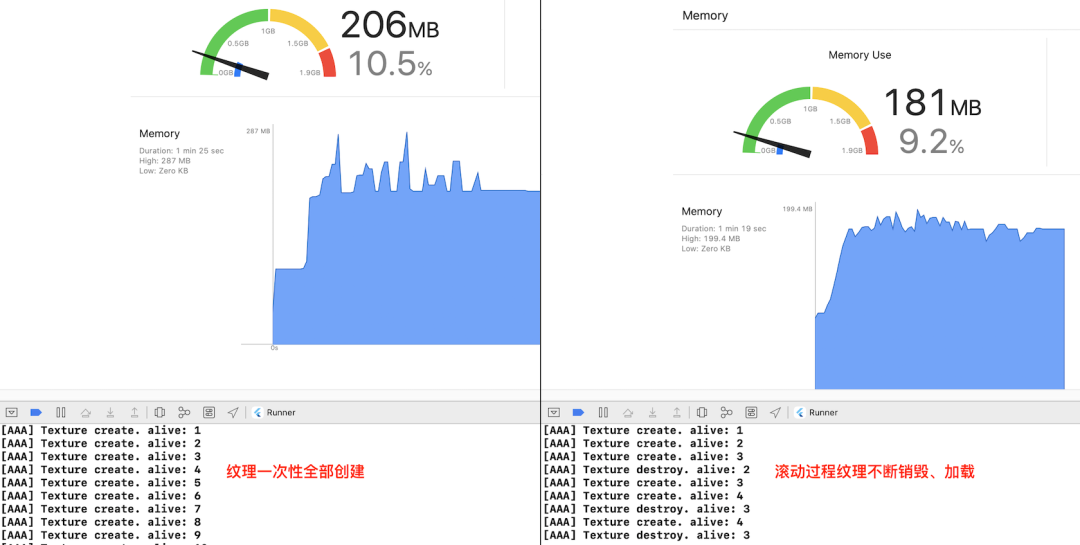 在 Demo 中效果非常好,原先滚动到图片时,一次性十张图片全部被加载;修改后,即使十张图片放在同一个 Cell 里,也一张一张加载并回收。如图,在底层打印纹理个数,并观察内存占用。