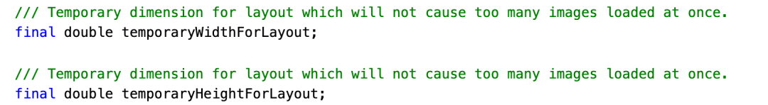 通过给 ExternalAdapterImageFrameCodec 添加 getImageInfo 接口,我们可以避免了离屏纹理的上传。但是因为图片缺乏高度信息,因此一进入页面时,仍然是堆叠在一起,产生了大量图片请求。这些图片请求通过外接图片库返回 UIImage(或 Android Bitmap) 对象,即使没有上传成纹理,仍然是较大的内存开销。 商品详情业务的特点是多张图片拼接而成,我们只能指定图片的宽度,需要图片高度自适应。因此针对这种场景,我们给 Flutter 的官方图片组件添加了一个给排版用的虚拟尺寸参数。-
