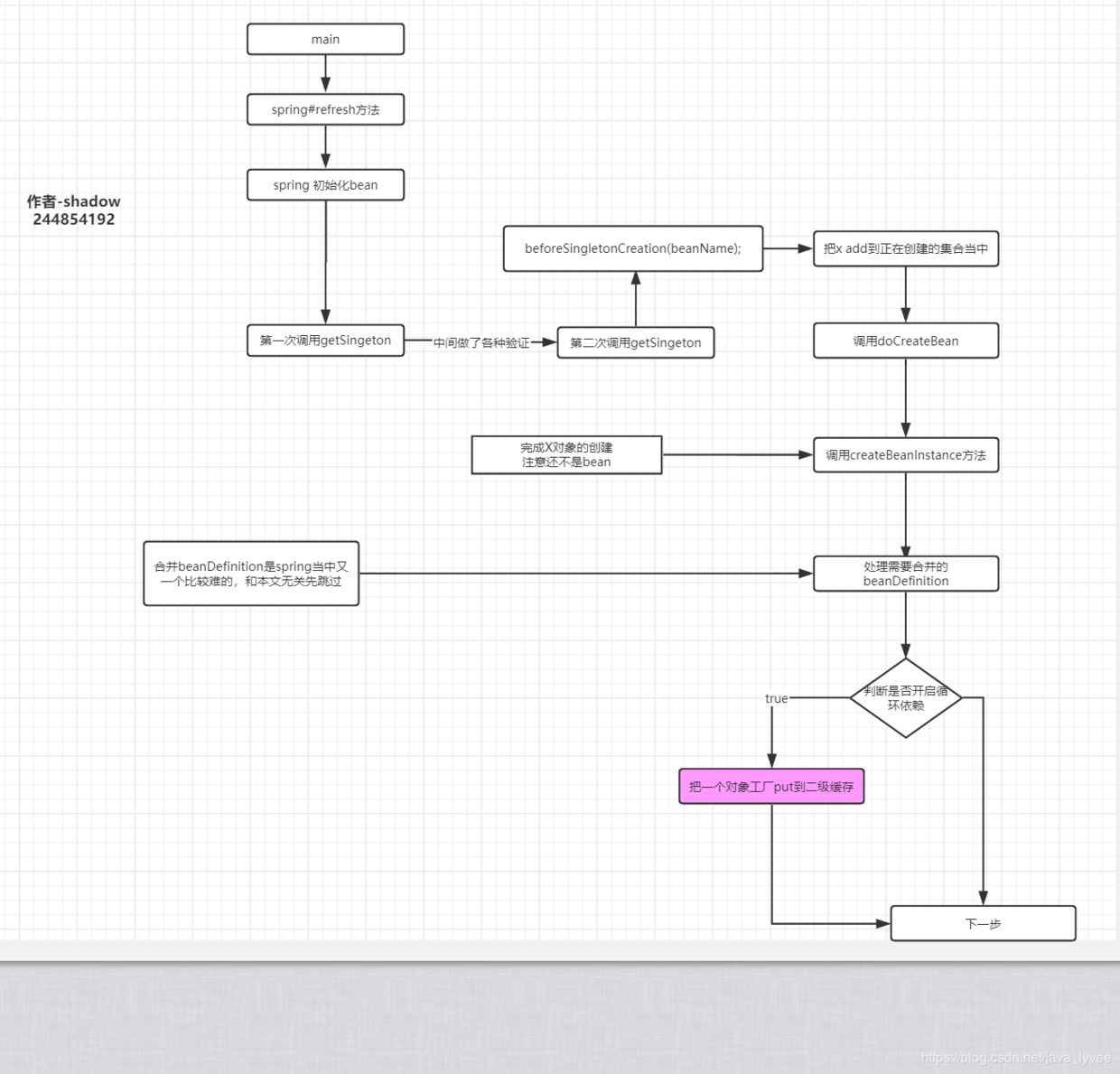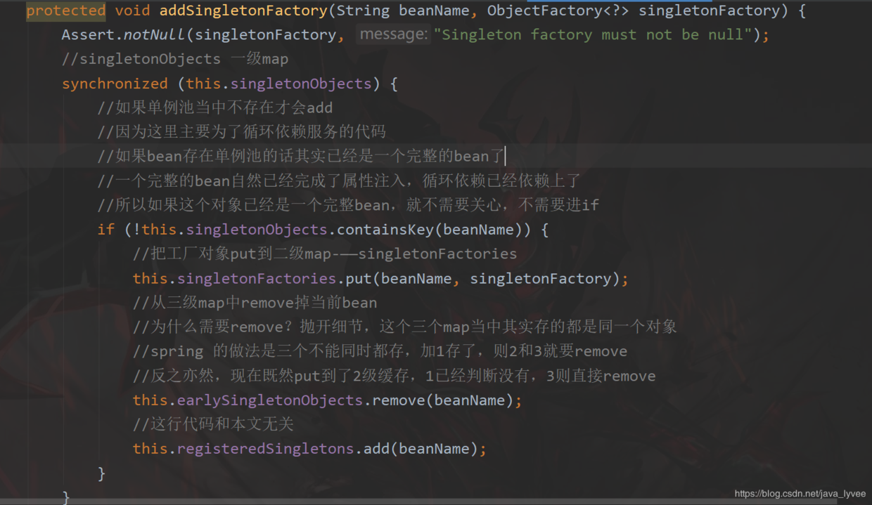通过代码可以得知singletonFactory主要被add到二级缓存中;至于为什么要add到这个map?主要了循环依赖,提前暴露这个工厂;当然如果你不理解为什么要提前暴露,没关系往下看,看完文章一定会知道的;