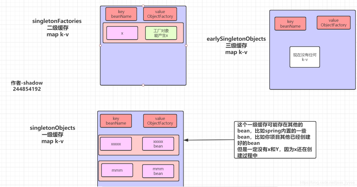 二级缓存:里面现在仅仅存在一个工厂对象,对应的key为x的beanName,并且这个bean工厂对象的getObect方法能返回现在的这个时候的x(半成品的xbean) put完成之后,代码接着往下执行;