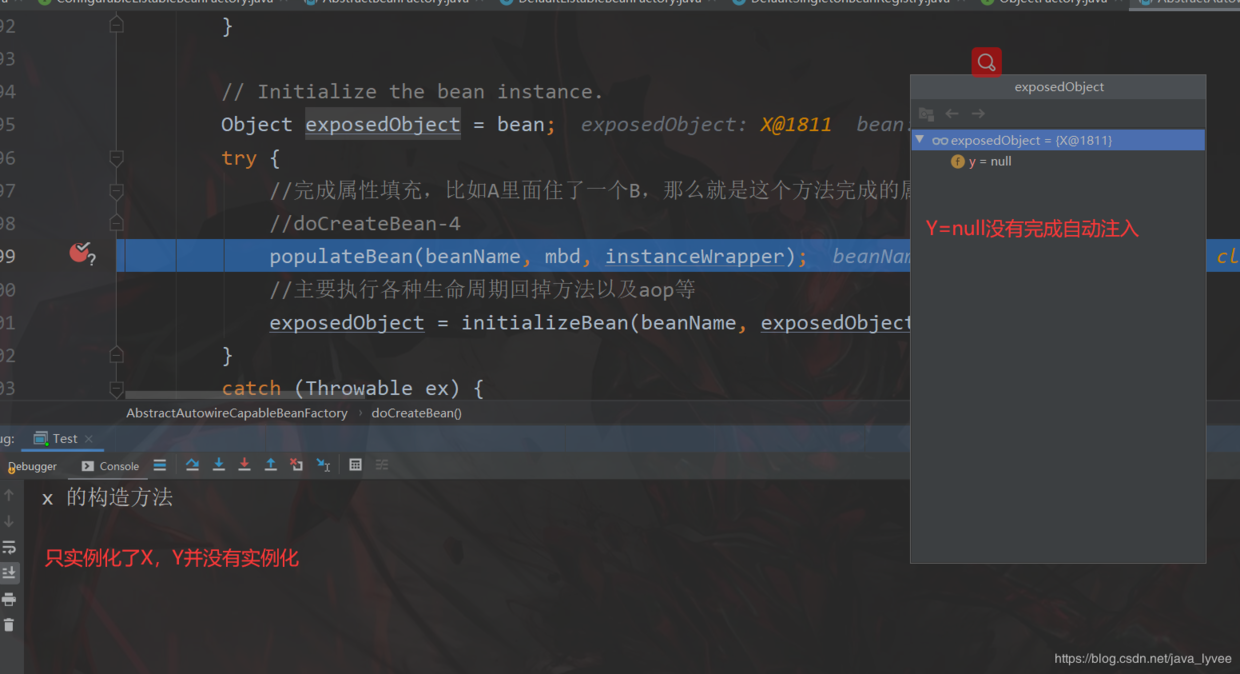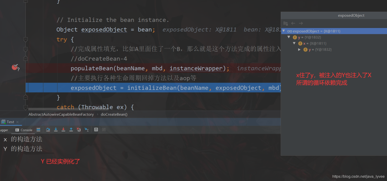 没有执行populateBean之前只实例化了X,Y并没实例化,那么Y也不能注入了;接下来看看执行完这行代码之后的情况