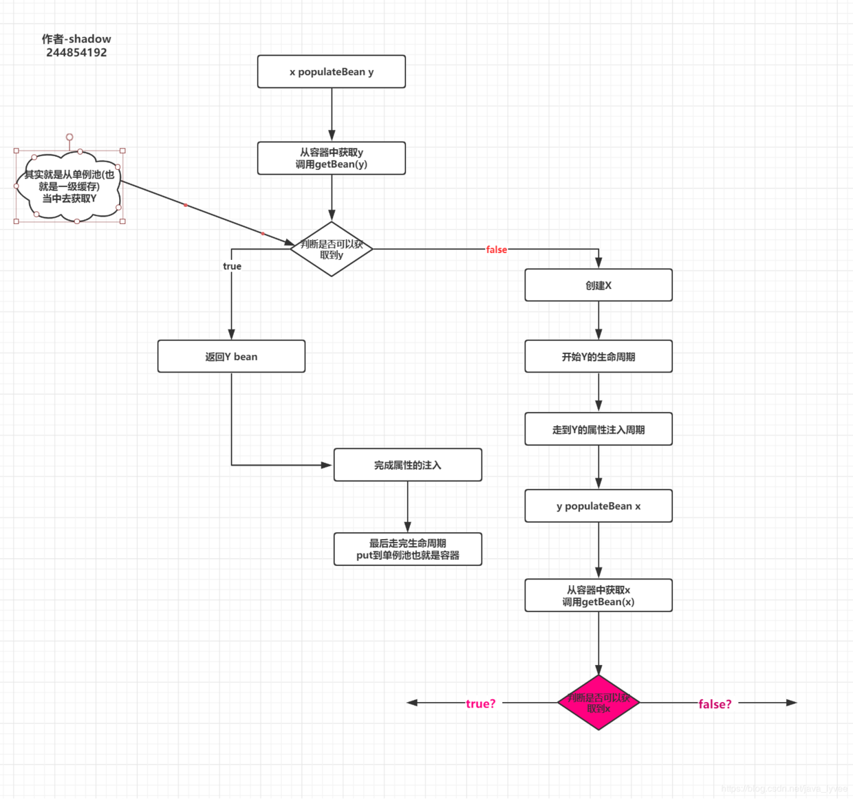 是否能够获取到x呢?首先我们想如果获取失败则又要创建x—>实例化x—填充属性----获取y--------。。。。。。。就无限循环了;所以结果是完成了循环依赖,那么这里肯定能够获取到x;那么获取到x后流程是怎样呢?