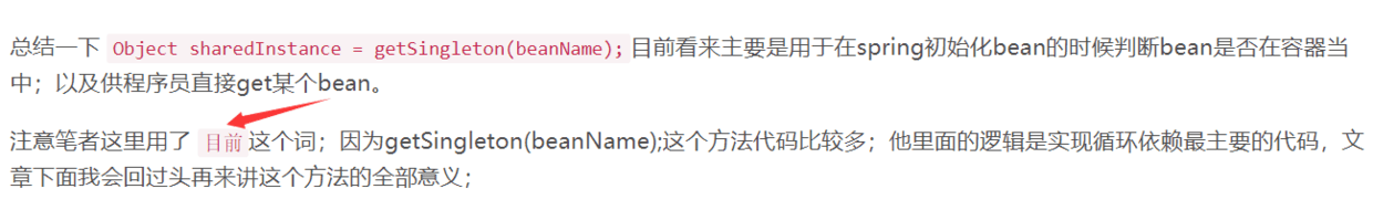 那么为什么能够获取到x呢?讲道理联系上文第一次调用getSingleton是无法获取到x的?因为我们上面说过第一次调用getSingleton是从单例池当中获取一个bean,但是x显然没有完成生命周期(x只走到了填充y,还有很多生命周期没走完),所以应该是获取不到的?为了搞清楚这个原因得去查看第一次getSingleton的源码;如果读者有留意的话笔者前面只是凭只管告诉你第一次getSingleton是从单例池当中获取一个bean,并没有去证明,也就是没有去分析第一次getSingleton的源码;而且我在总结第一次getSingleton的时候用了目前这个词;证据如下(图是本文前面的内容,为了翻阅方便我直接贴这里了)