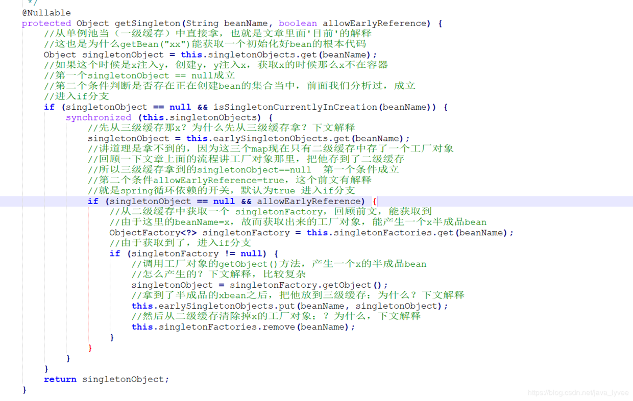 针对上面的源码我做一个简单的总结:首先spring从单例池当中获取x,前面说过获取不到,然后判断是否在正在创建bean的集合当中,前面分析过这个集合现在存在x,和y;所以if成立进入分支;进入分支spring直接从三级缓存中获取x,根据前面的分析三级缓存当中现在什么都没有,故而返回nll;进入下一个if分支,从二级缓存中获取一个ObjectFactory工厂对象;根据前面分析,二级缓存中存在x,故而可以获取到;跟着调用singletonFactory.getObject();拿到一个半成品的x bean对象;然后把这个x对象放到三级缓存,同时把二级缓存中x清除(此时二级缓存中只存在一个y了,而三级缓存中多了一个x);