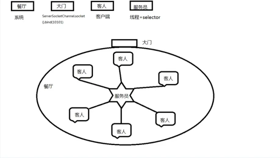 - 通过serverChannel.register(selector, SelectionKey.OP_ACCEPT)将serverChannelSocket和selector绑定,就像是让服务员看着点大门,有人来了就去招呼一声。这个时候创建工作就完成的差不多了。