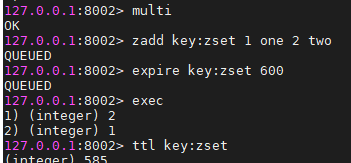 set命令是原生支持添加键的同时设置过期时间,而其他类型的键则可以通过管道或事务添加过期时间,例子: