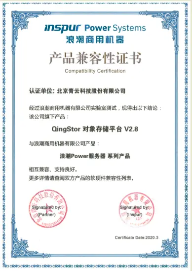 经浪潮商用机器有限公司实验室测试,青云QingCloud 旗下 QingStor®️ 对象存储平台 V2.8 与浪潮 Power 服务器系列产品相互兼容、支持良好。