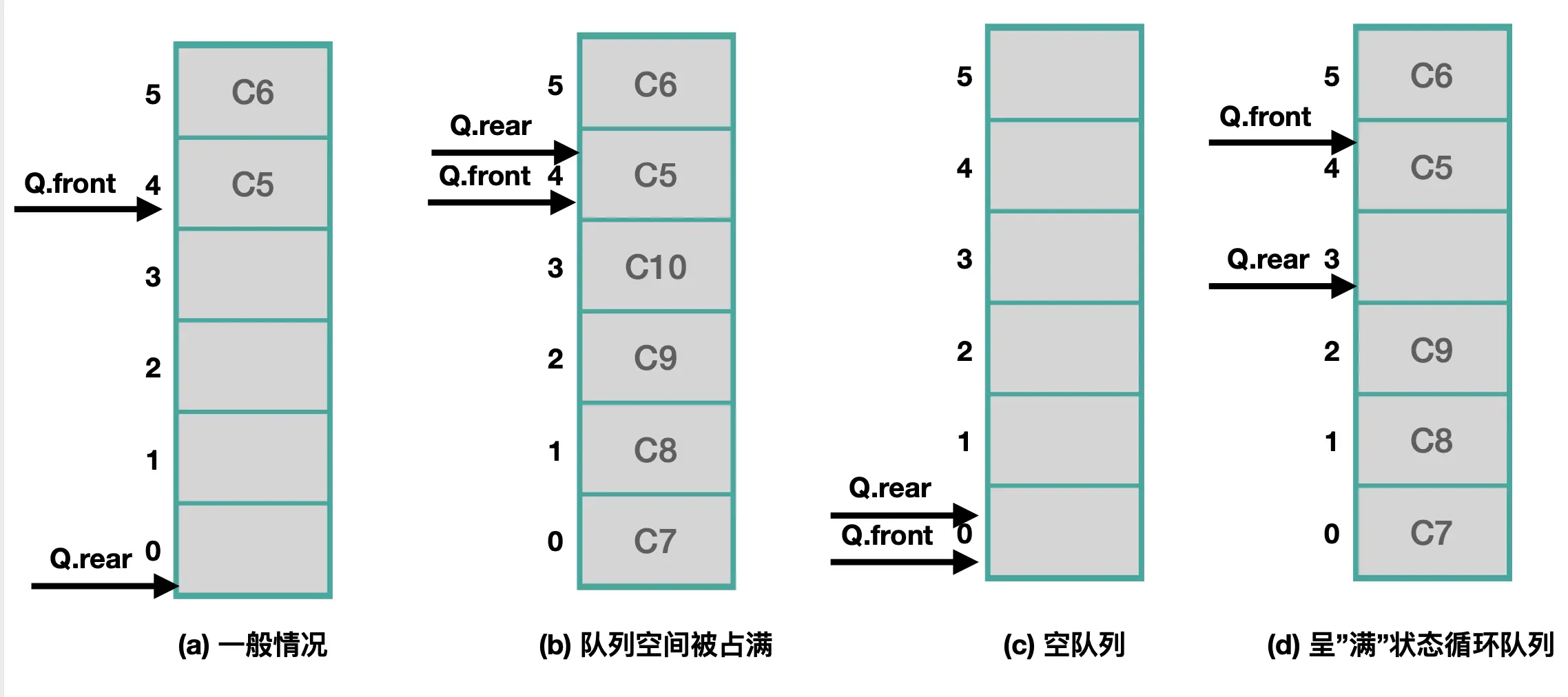 判断队满: if(Qrear + 1) % MAZSIZE == Q.front