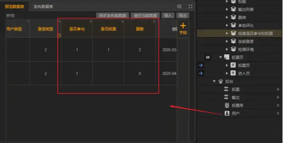 由于demo是运行在微信环境下,可以由用户组件直接发起微信公众号登录,所以我们直接使用用户组件存储候选人信息,以openID作为唯一标识,这里给用户组件额外添加了三个字段,是否参与用来标记用户是否为候选人,是否投票用于标记用户是否进行过投票,票数则是存储候选人用户已经获得的票数。