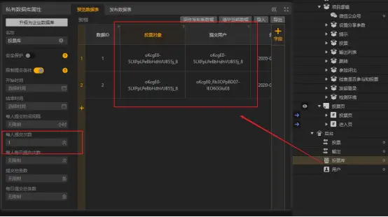 投票流水记录我们使用数据库——投票库进行记录,因为数据库默认就会设置提交用户的字段,所以我们只需要再添加一个投票对象的字段即可。不过要注意这里我们给数据库限制了提交条件,每位用户只能提交1次,第二次提交会失败并且反馈失败原因为超出提交次数,我们就是通过这种方式限制每个用户只能投票一次。