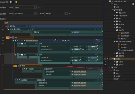 前面说过,系统会自动在提交用户字段填入当前用户的openID,所以投票服务只需要候选人openID这一个接收参数,首先我们将候选人openID提交到投票库来添加一条投票流水记录,添加成功后再去用户组件找到当前用户将其是否投票改为1,找到该候选人将其票数加1。