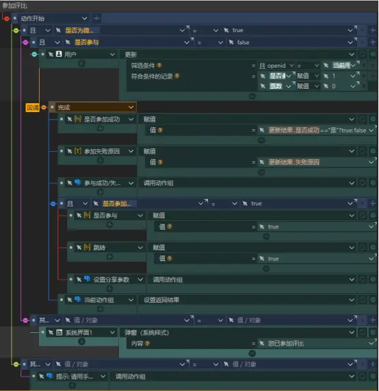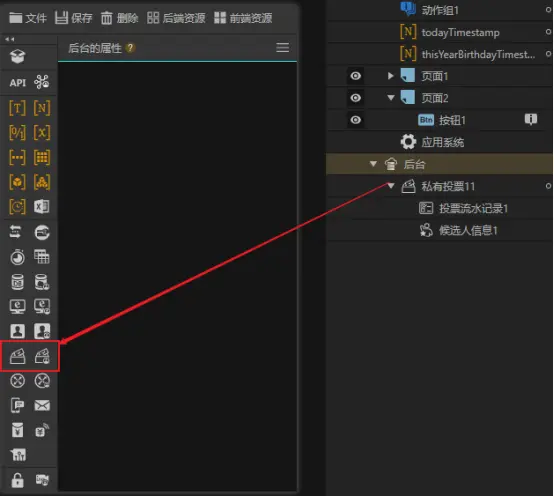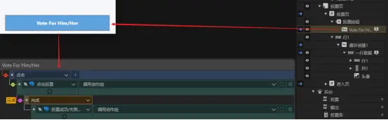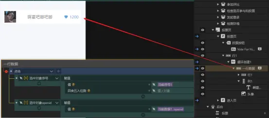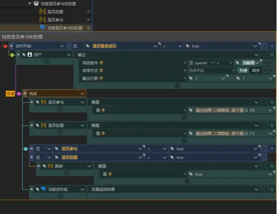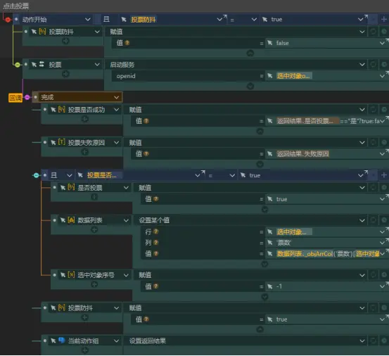 ivx中也有封装好的投票组件,添加后可以看到自动包含投票流水记录和候选人信息两个数据库,而且这两个数据库也都可以通过限制提交条件来限制每位用户的投票票数,另外投票和获取候选人列表的操作也都已经封装成投票组件的动作。这类案例中,由于涉及多个数据库,还有前后台,所以最重要的就是流程的处理,必须上一步骤完成并给出反馈后再依据反馈进行下一步骤,否则如果某一步骤出错就会导致前台后台票数不一致,投票流水和候选人票数对不上等问题。