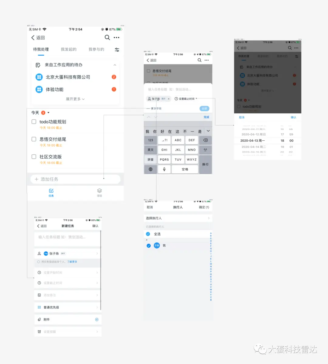 添加待办事项分为俩种。一种是设置自己为执行人,另一种设置他人(多人)为执行人,满足团队协作需求。其中还包括时间、优先级、提醒等功能。