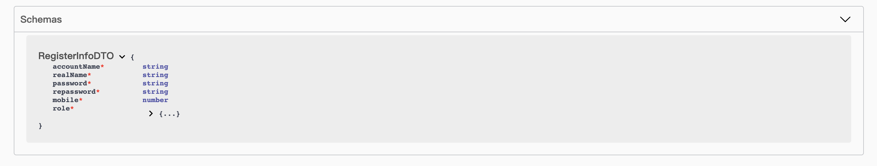 点开 RegisterInfoDTO,发现里面是空的,接下来,我们配置一下参数信息,在 user.dto.ts 中引入 ApiProperty,然后添加到之前的 class-validator 上: