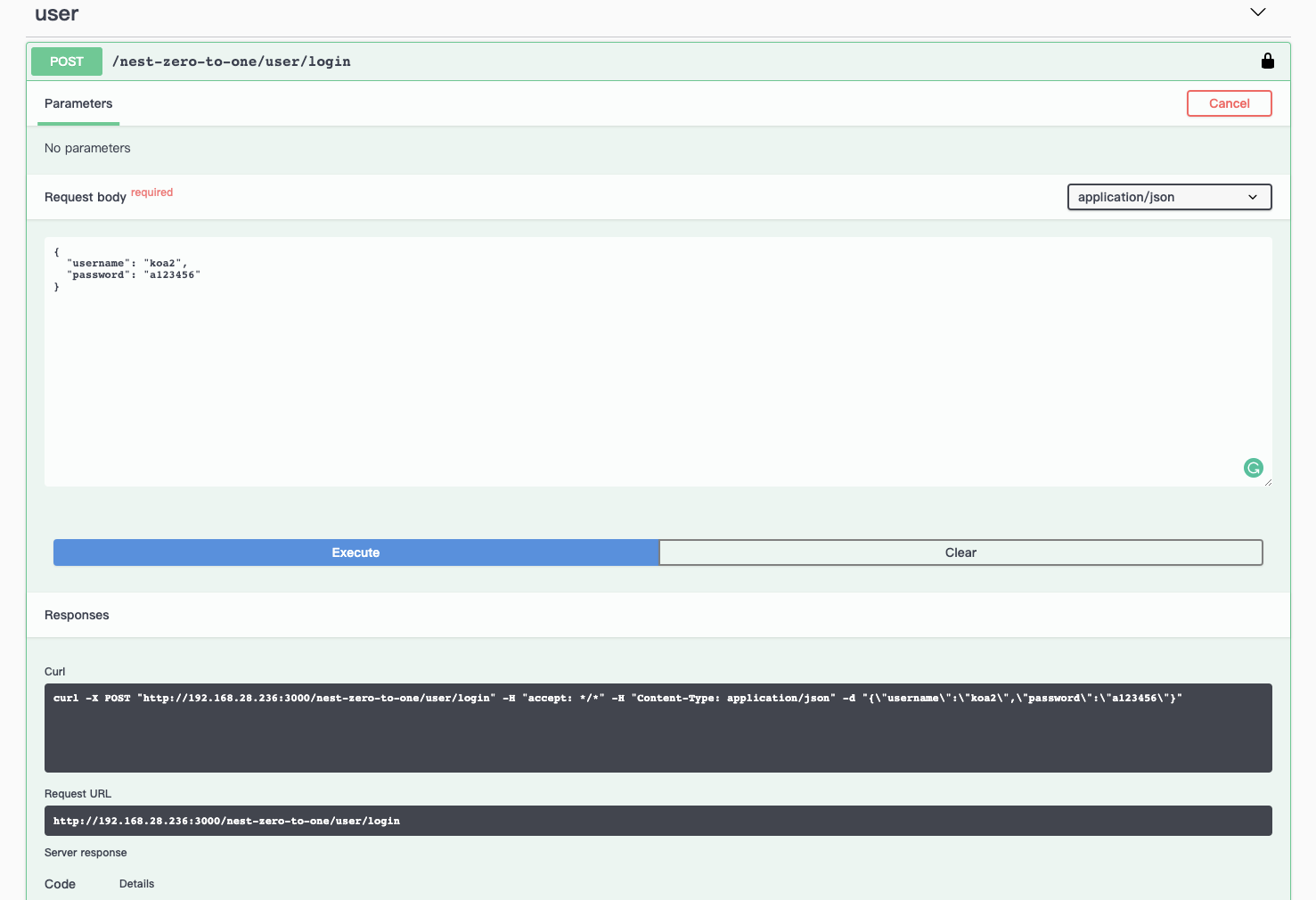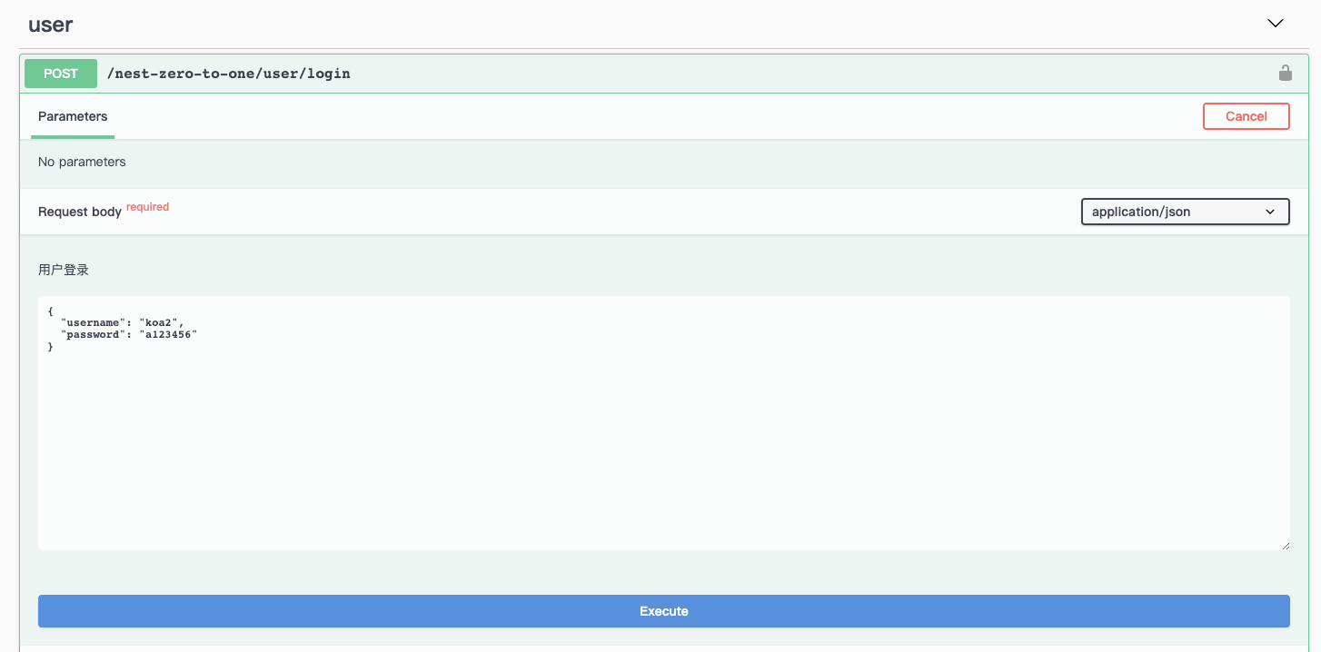 接下来,我们测试一下注册接口的请求,先编辑参数,然后点击 Execute: