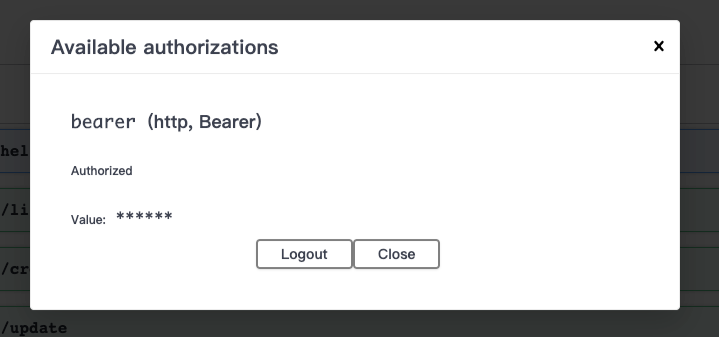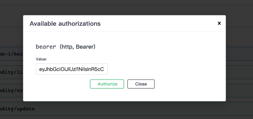 将 token 复制到弹窗的输入框,点击 Authorize,即可授权成功: