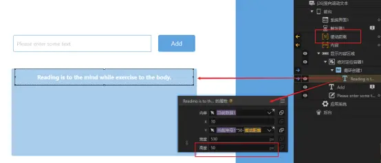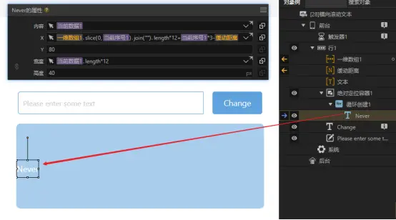 对于循环创建的文本组件,我们将X坐标填入“一维数组1.slice( 0 , 当前序号1 ).join(“”).length*12+当前序号1*3-缓动距离”,这里是先使用slice()方法将一维数组中当前元素之前的元素提取为一个新的数组,将这个新的数组用join()方法转换成一个字符串,并计算字符串中的字符数量然后乘以12(这里的12是取了比每个英文字母所占的px宽度略大一点的值),另外还要加上“当前序号1*3”,这里的3是文本组件之间的间距,乘以当前序号1即前面所有间距的和,最后与纵向滚动同理最后也要减去“缓动距离”。至于文本组件的宽度就设置为当前数据的长度*12即可,注意要与X坐标属性中填入的值保持一致。
