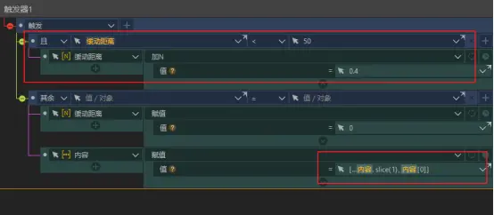 接下来就是通过触发器不断改变缓动距离实现向上滚动的效果。我们让触发器每隔0.01s触发一次,将所有文本组件上移0.4px也就是“缓动距离”加上0.4,直到缓动距离大于等于50,此时第一行文本刚好彻底移出界面,我们将缓动距离归零,并把第一行文本的内容,也就是一维数组的第一个元素移到数组末尾。这里用slice()方法提取了一维数组1号元素及之后的元素形成一个新的数组,然后用这个新的数组和原数组的0号元素组合并重新赋值给原一维数组。至此,一个纵向循环滚动的效果就制作完成了。