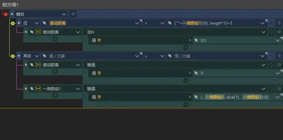 对于触发器,我们需要更改触发事件中的条件判断,前面说过缓动距离与一维数组的第一个元素内容长度有关,所以用length计算0号元素的长度并乘以12然后加上一个文本间距的宽度3作为“缓动距离”的最大取值,当“缓动距离”大于等于这个值时则说明第一个单词全部滑出界面,此时就可以将一维数组的0号元素调整到数组末尾。(数组元素直接用length计算长度会报错,需要加上一个空字符转换成字符串格式)