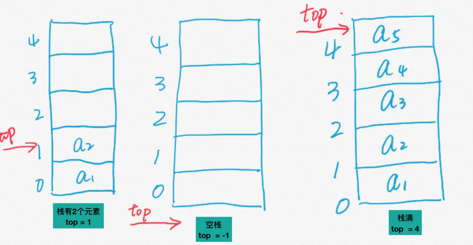 我们是top来标记栈里面有几个元素的,当top = -1时候代表是空栈,当top = 0 时代表有一个元素,当top 指向栈顶时候代表栈满了。