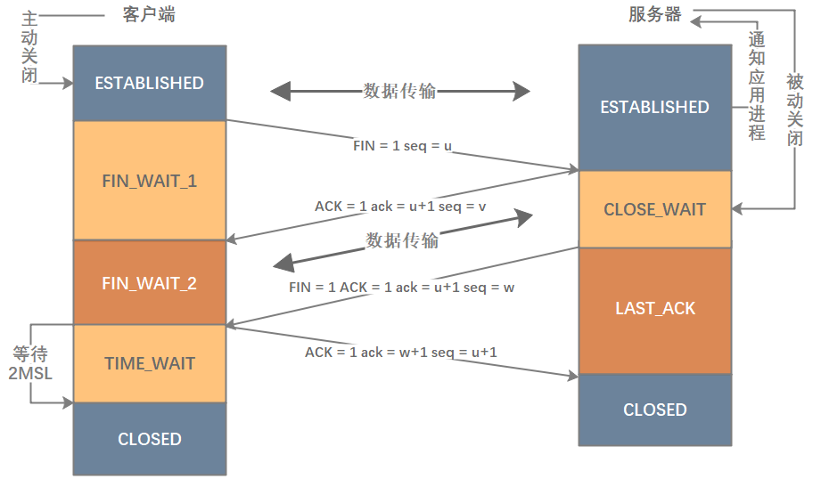 服务端发送一个FIN到客户端,然后关闭客户端的连接。因此FIN=1,ack还是原来的u+1。服务器可能在半关闭状态中又发送了一些数据,就不用原来的seq=v了,假定seq=w。