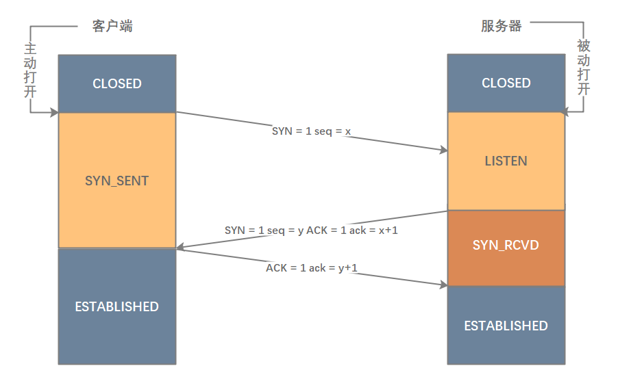 收到请求报文之后,如果同意连接,服务端会发出建立连接和确认报文,因此SYN=1,ACK=1。由于含有ACK所以带上一个确认号ack=x+1,由于含有SYN所以随机生成一个序列号seq。这时服务器进入SYN-RCVD(同步已收到)状态。