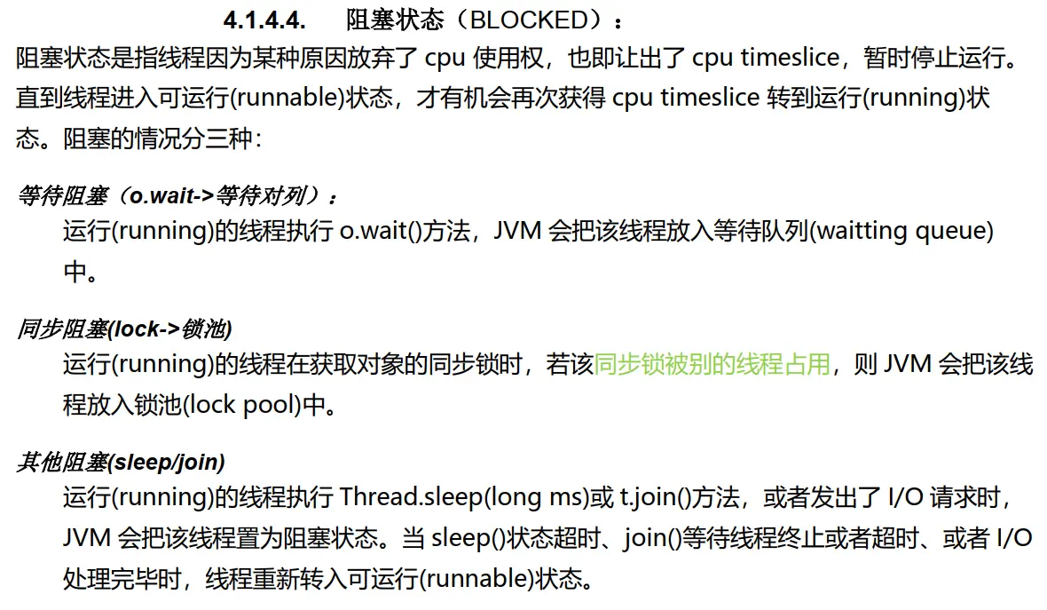 - 阻塞状态(Blocked)--线程因为某种原因放弃 CPU 使用权,暂时停止运行;sleep,join;