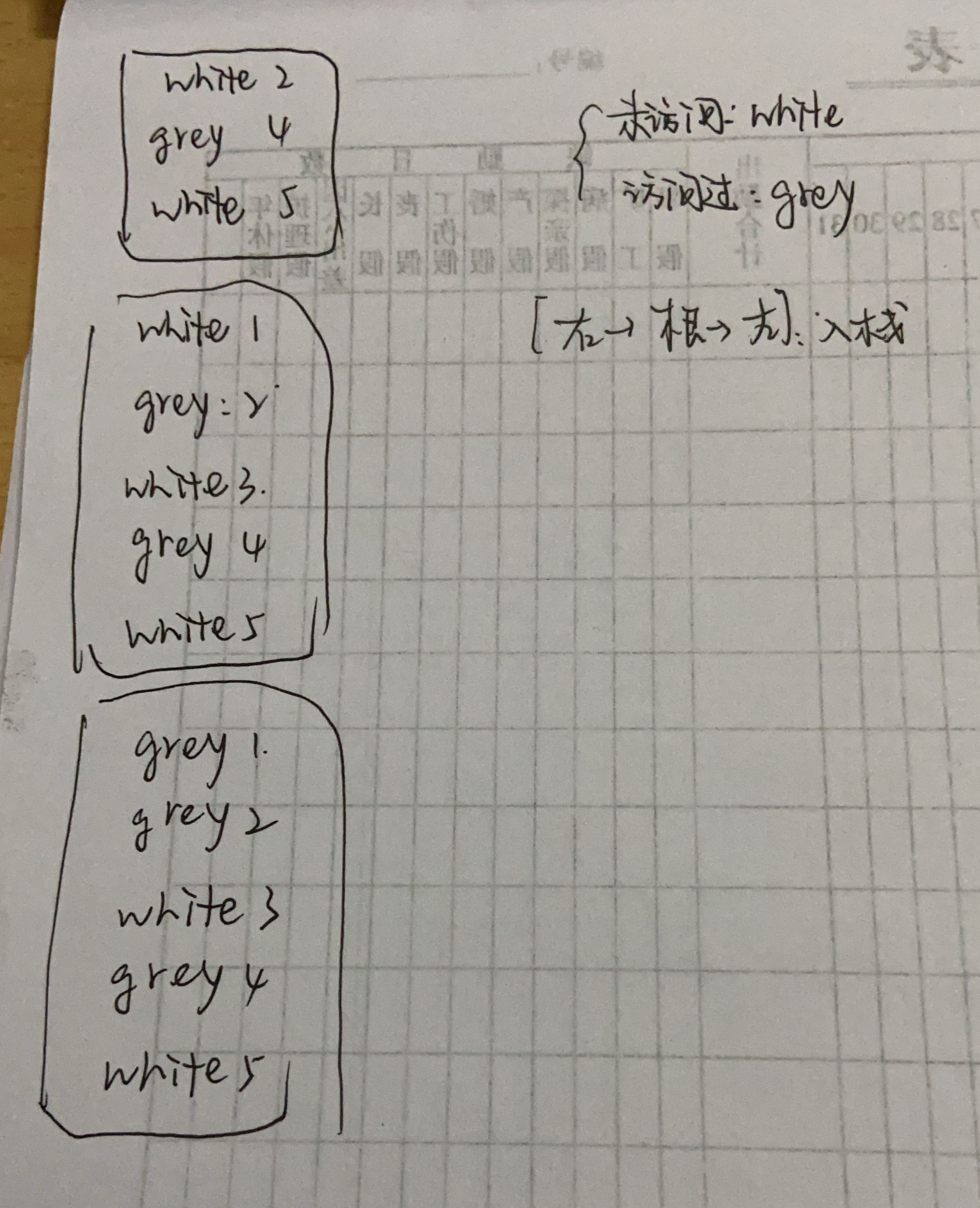 - 如果遇到的节点为灰色,则将节点的值输出。