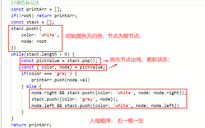 - 颜色标记法(这个方法是看解析学来的,其实只要改变入栈顺序就可以实现各种遍历,旋转点赞!!谢谢分享~):
